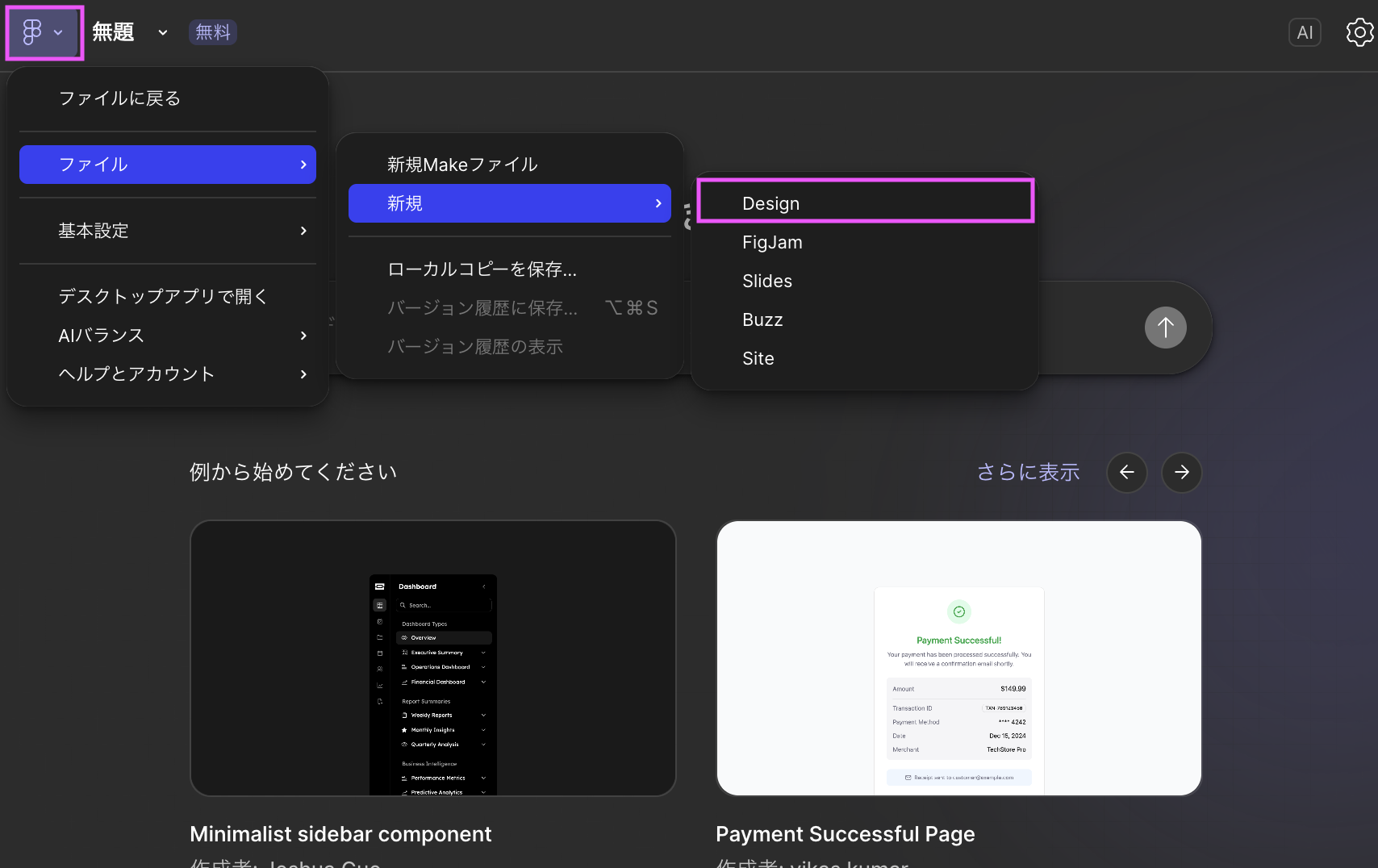 左上のFigmaアイコン→ファイル→新規→Designでファイルが開きます。