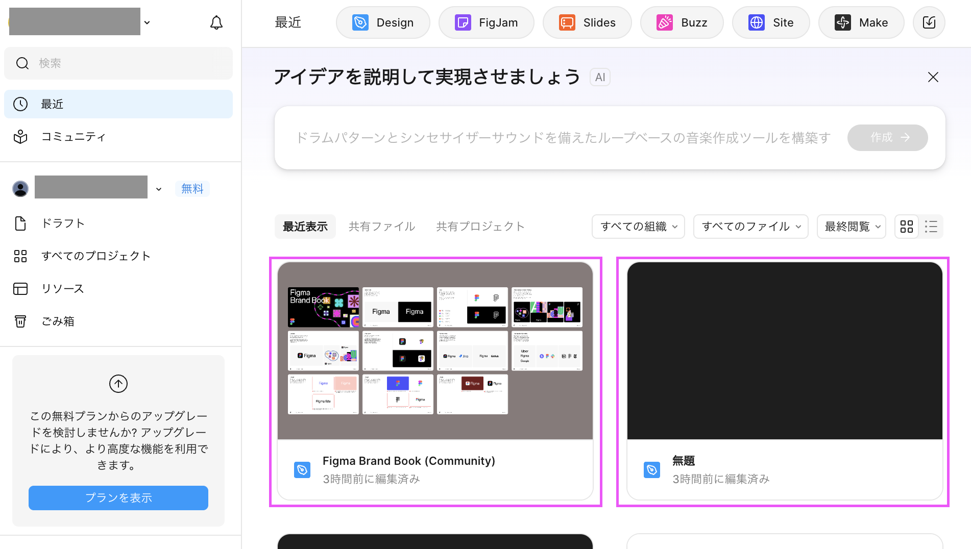 ファイルを開いている状態であれば、左上のFigmaアイコン→ファイルに戻るでダッシュボードに戻ります。