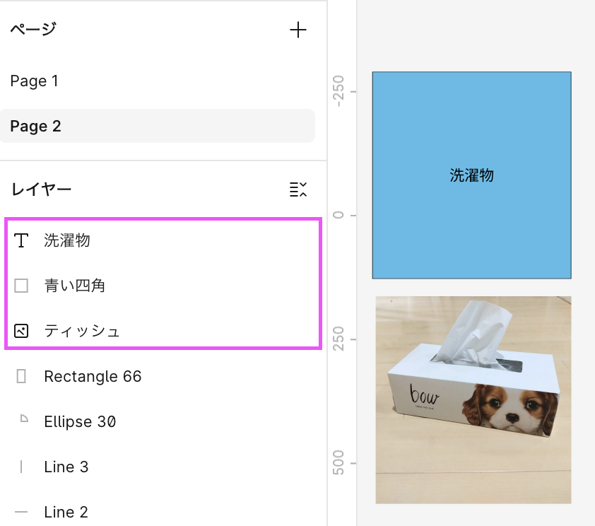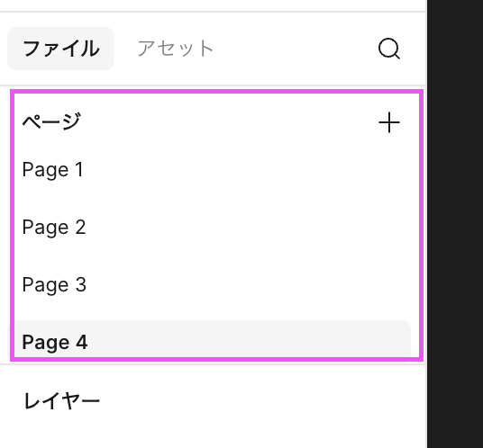 1つのFigmaファイルの中に作れる「作業の区切り」です。例えると、ファイル=ノート、ページ=ノートの1ページです。