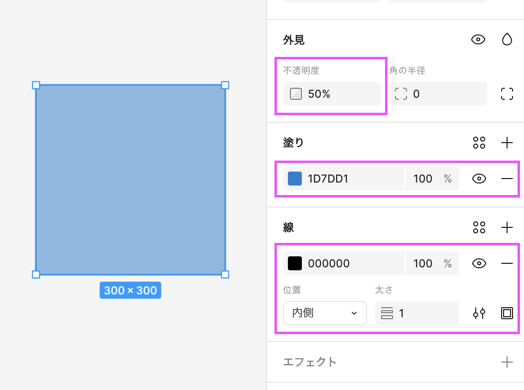・塗りつぶし:右サイドバーにある塗りの色を変更します。塗りつぶしをやめて透明にしたいときは、「ー」アイコンをクリックします。