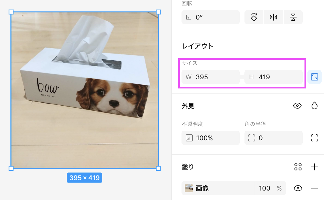 寸法を変更するには、右サイドバーにあるレイアウト–サイズのWとHを変更します。数字を入力するか、矢印キーで調節します。