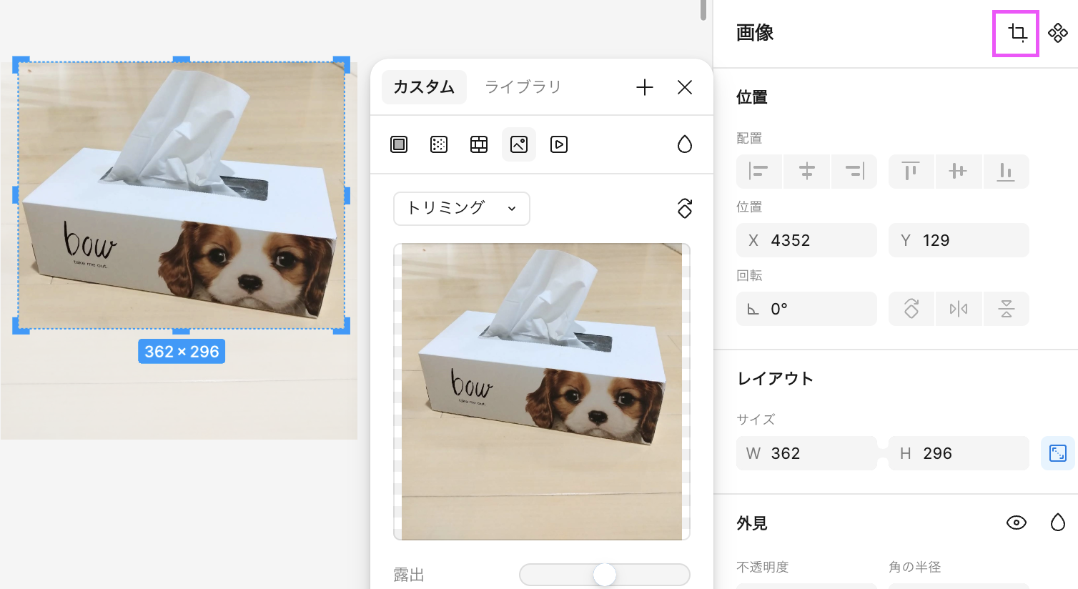 画像のトリミングが可能です。右サイドバーの画像の中にあるトリミングアイコンをクリックします。すると画像に青い枠のマークが表示されるので、これをカーソルで動かして調節します。